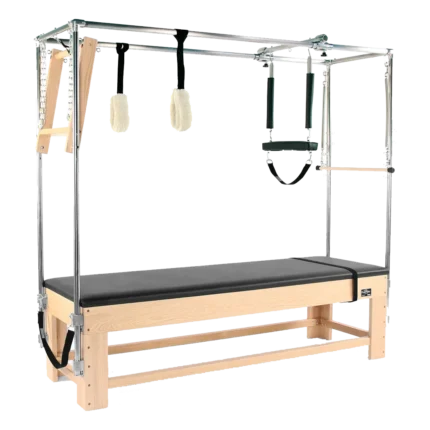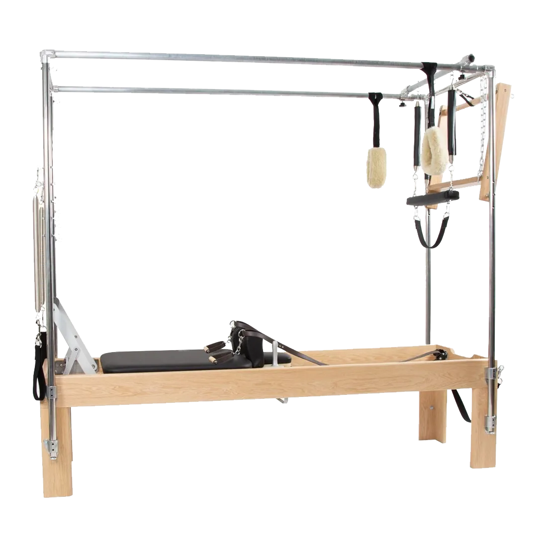 A Cadillac és a Reformer kombinációjával egy felhasználóbarát rendszert hoztunk létre, amely hihetetlenül sokoldalú, és könnyedén válthat mindkét üzemmód között. Kézzel készített tömörfa vázszerkezet, tölgy vagy bükkfa kivitelben, fekete kárpitozással és vegánbarát szintetikus pántokkal felszerelve.